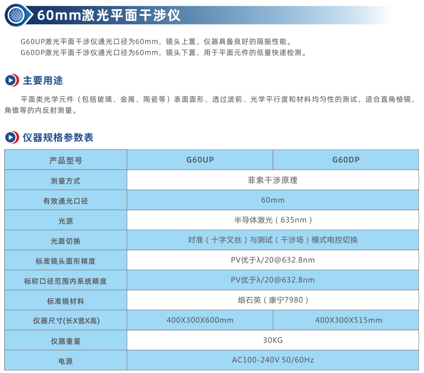 G60UP激光平面干涉儀通光口徑為60mm,鏡頭上置,儀器具備良好的隔振性能。