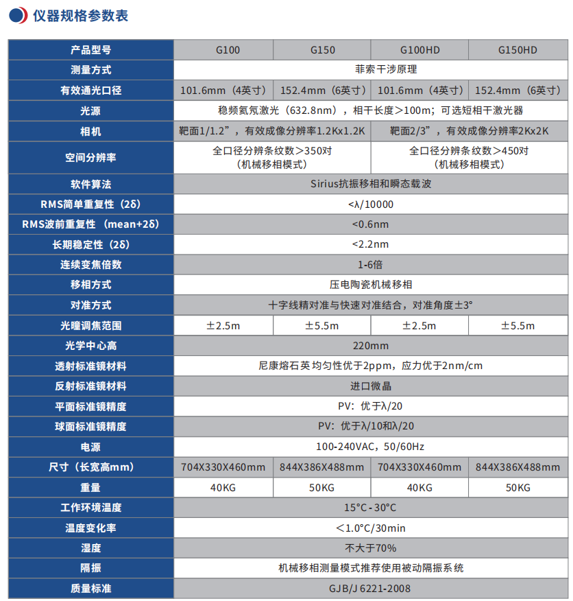 G100、G150和G200臥式激光干涉儀的有效口徑分別為100mm (4英寸)、150mm (6英寸)和200mm (8英 寸)。乾曜光學(xué)將世界先進(jìn)干涉測(cè)量技術(shù)與大尺寸、 大曲率鏡片測(cè)量的市場(chǎng)需求相結(jié)合,優(yōu)化光學(xué)系統(tǒng)和機(jī)械系統(tǒng)結(jié)構(gòu),將高精度的成像系統(tǒng)和圖像采集系統(tǒng),穩(wěn)定的激光干涉技術(shù)和1-6倍圖像放大功能等一系列高精技術(shù)融合,滿足科研級(jí)高精密光學(xué)元件和光學(xué)系統(tǒng)的測(cè)量的高端要求。