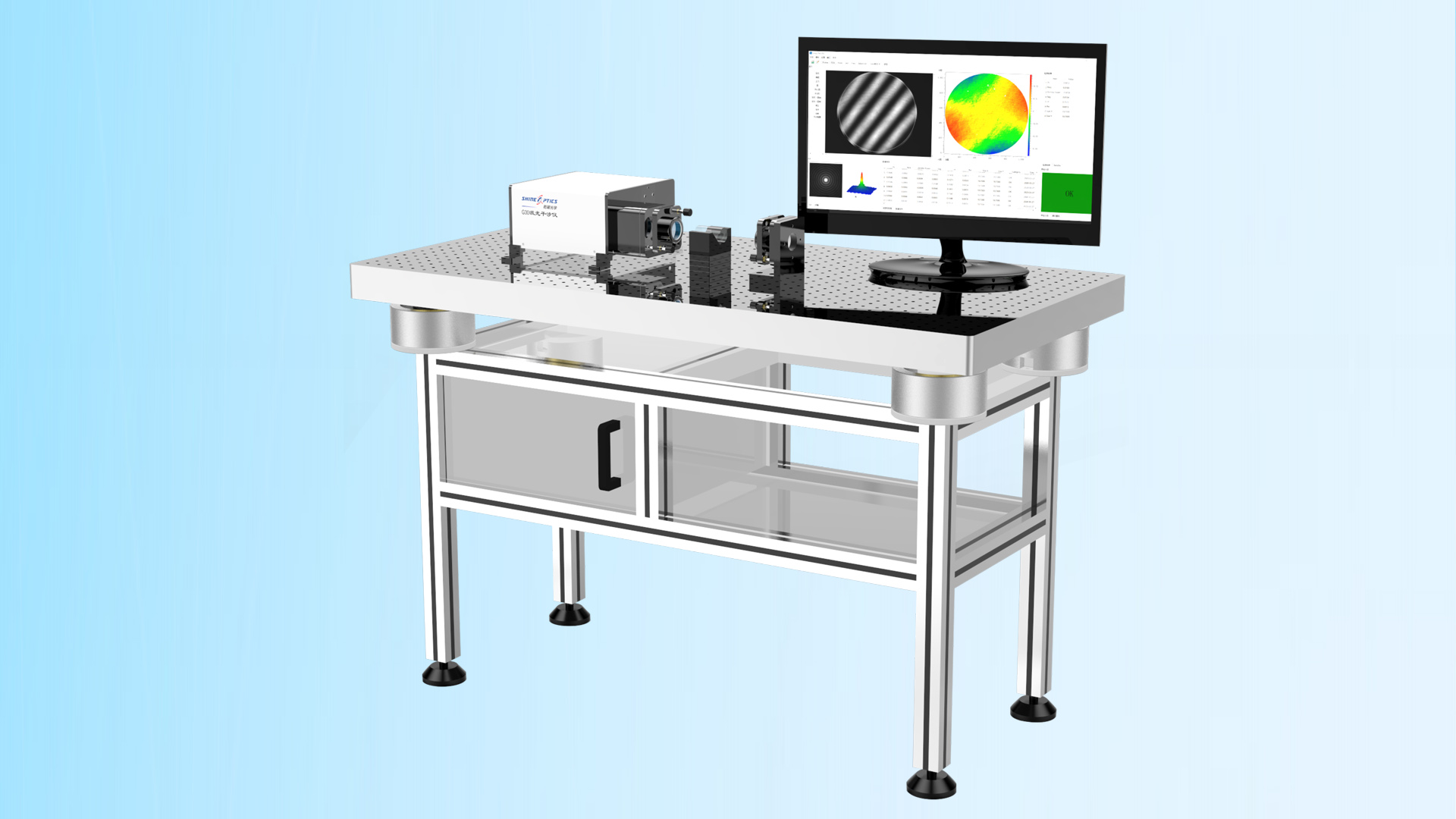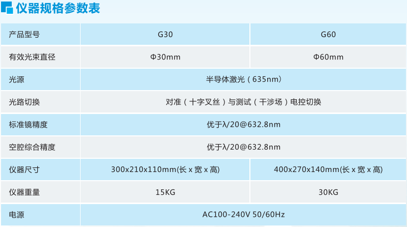 G30 G60 激光干涉儀通光口徑為Φ30mm,Φ60mm,儀器具備良好的隔振性能。用于平面檢測(cè)(透過、反射),標(biāo)準(zhǔn)鏡頭有F0.6, F0.7,F1.0, F1.4, F2.0, F2.8, F5.6,可定制其他F數(shù)的鏡頭;也可選配平面標(biāo)準(zhǔn)鏡及相關(guān)治具測(cè)量平面鏡。