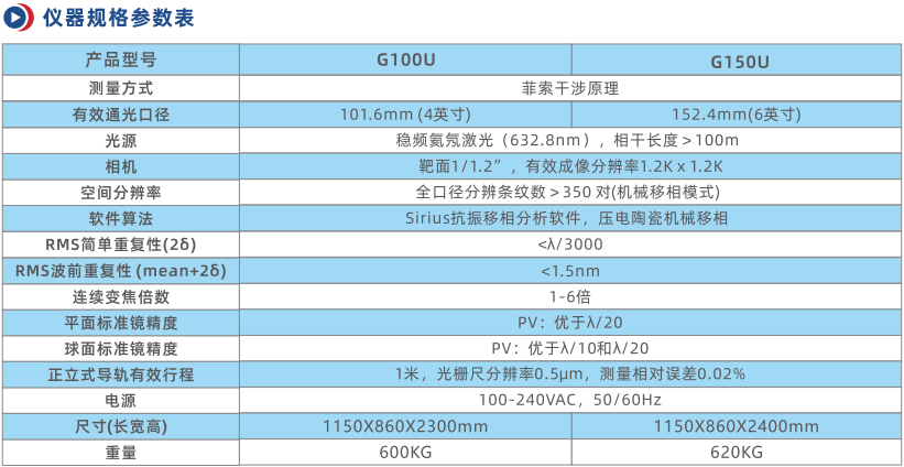 G100U和G150U是乾曜光學(xué)新開發(fā)的兩款正立式激光干涉儀工作站,有效口徑分別為101.6mm(4英寸)和152.4mm(6英寸)。可以測量平面面形、球面面形和曲率半徑,選配雙五維載物臺(tái),可以測量透過波前和非球面的補(bǔ)償法測量。