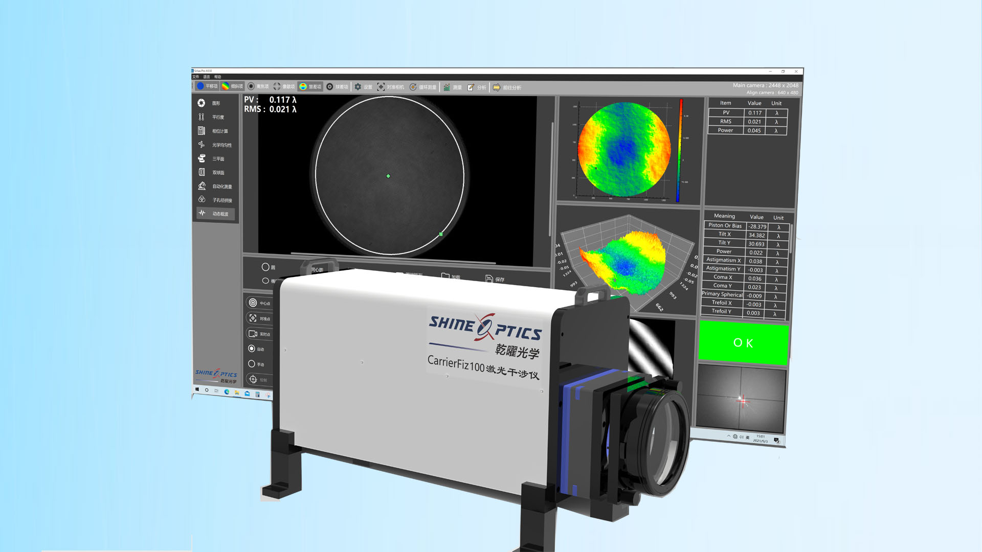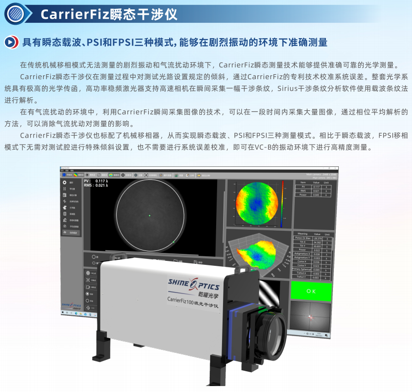 在傳統(tǒng)機(jī)械移相模式無(wú)法測(cè)量的劇烈振動(dòng)和氣流擾動(dòng)環(huán)境下,CarrierFiz瞬態(tài)測(cè)量技術(shù)能夠提供準(zhǔn)確可靠的光學(xué)測(cè)量。統(tǒng)具有極高的光學(xué)傳函,高功率穩(wěn)頻激光器支持高速相機(jī)在瞬間采集一幅干涉條紋,Sirius干涉條紋分析軟件使用載波條紋法進(jìn)行解析。