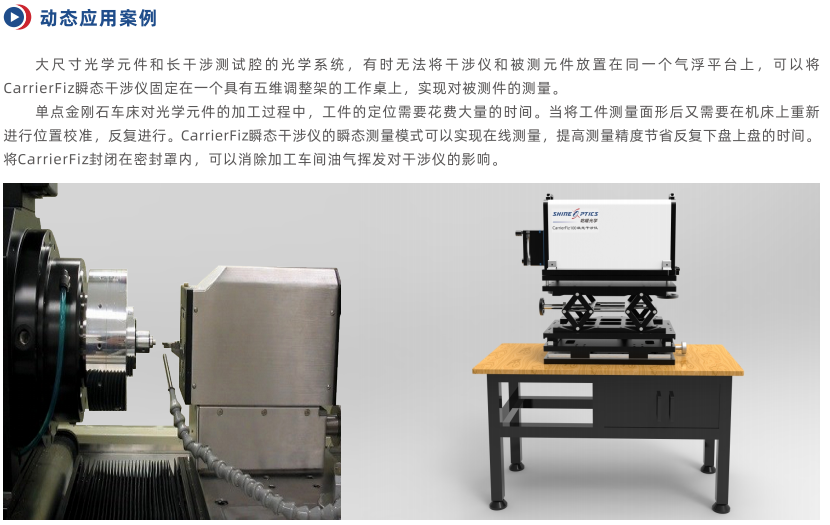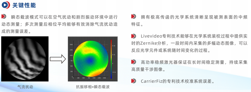 CarrierFiz瞬態(tài)干涉儀在測(cè)量過(guò)程中對(duì)測(cè)試光路設(shè)置規(guī)定的傾斜,通過(guò)CarrierFiz的專利技術(shù)校準(zhǔn)系統(tǒng)誤差。整套光學(xué)系在有氣流擾動(dòng)的環(huán)境中,利用CarrierFiz瞬間采集圖像的技術(shù),可以在一段時(shí)間內(nèi)采集大量圖像,通過(guò)相位平均解析的方法,可以消除氣流擾動(dòng)對(duì)測(cè)量的影響。
